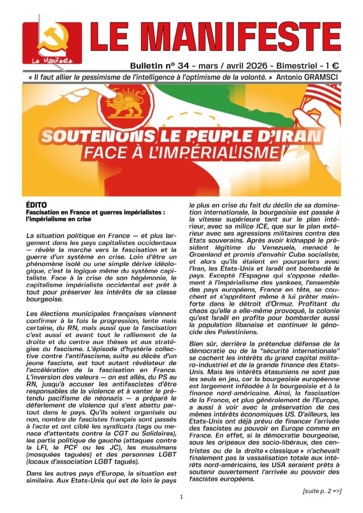 Retrouvez le dernier numéro de notre journal Le Manifeste, accompagné d’un sommaire détaillé et d’un fichier PDF téléchargeable, permettant à chacun d’accéder à l’ensemble des contributions et de nourrir la réflexion militante communiste.