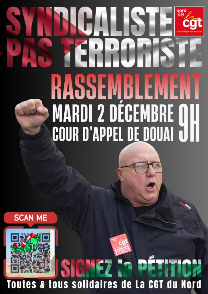 Le 2 décembre prochain, la cour d’appel de Douai va juger Jean Paul DELESCAUT, Secrétaire Général de l’Union Départemental CGT du Nord, condamné en première instance pour « apologie du terrorisme » à 1 an de prison avec sursis.