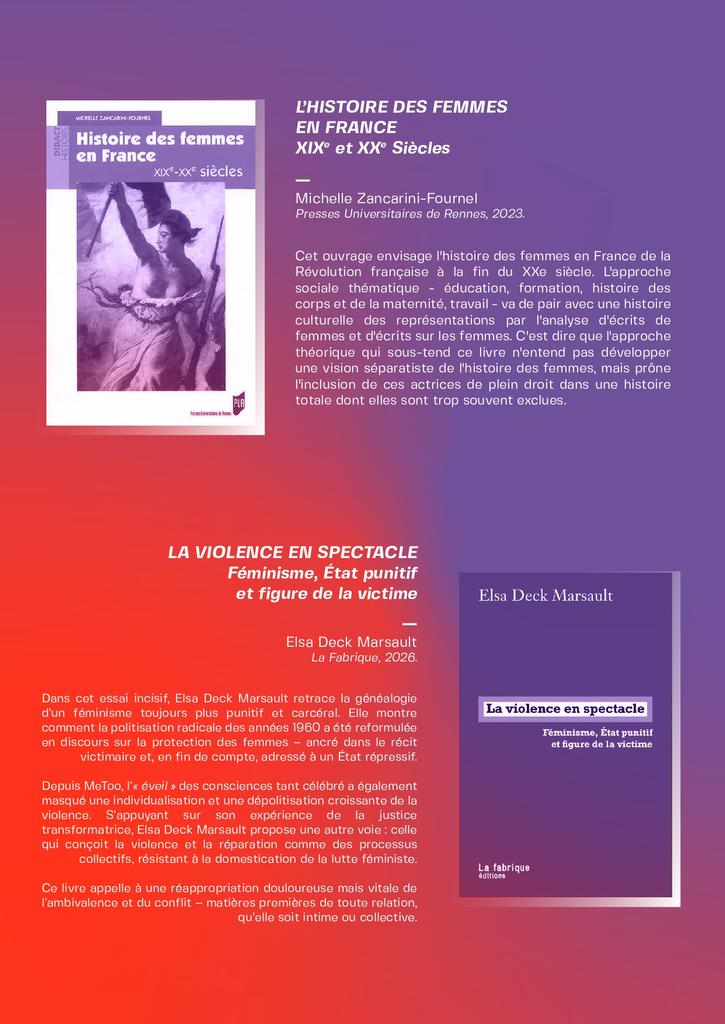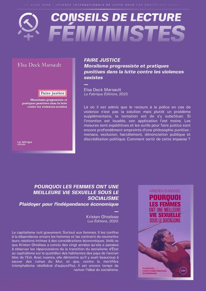 La lecture est une arme d’émancipation. Pour comprendre les mécanismes d’oppression il faut connaitre l’histoire et analyser les récits de nos camarades qui ont lutté avant nous. Notre organisation propose une sélection d’ouvrages féministes choisis pour leur pertinence politique et leur capacité à nourrir la réflexion collective.
