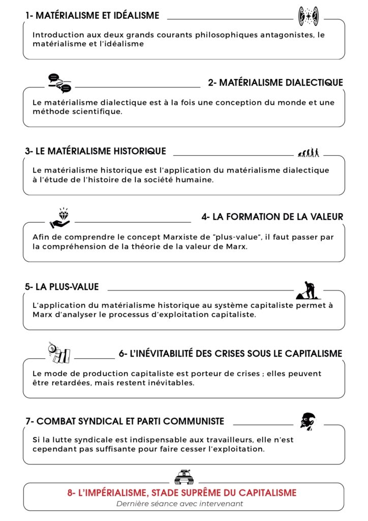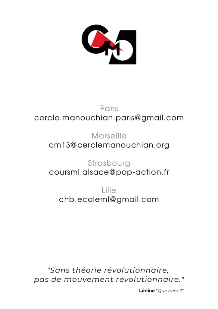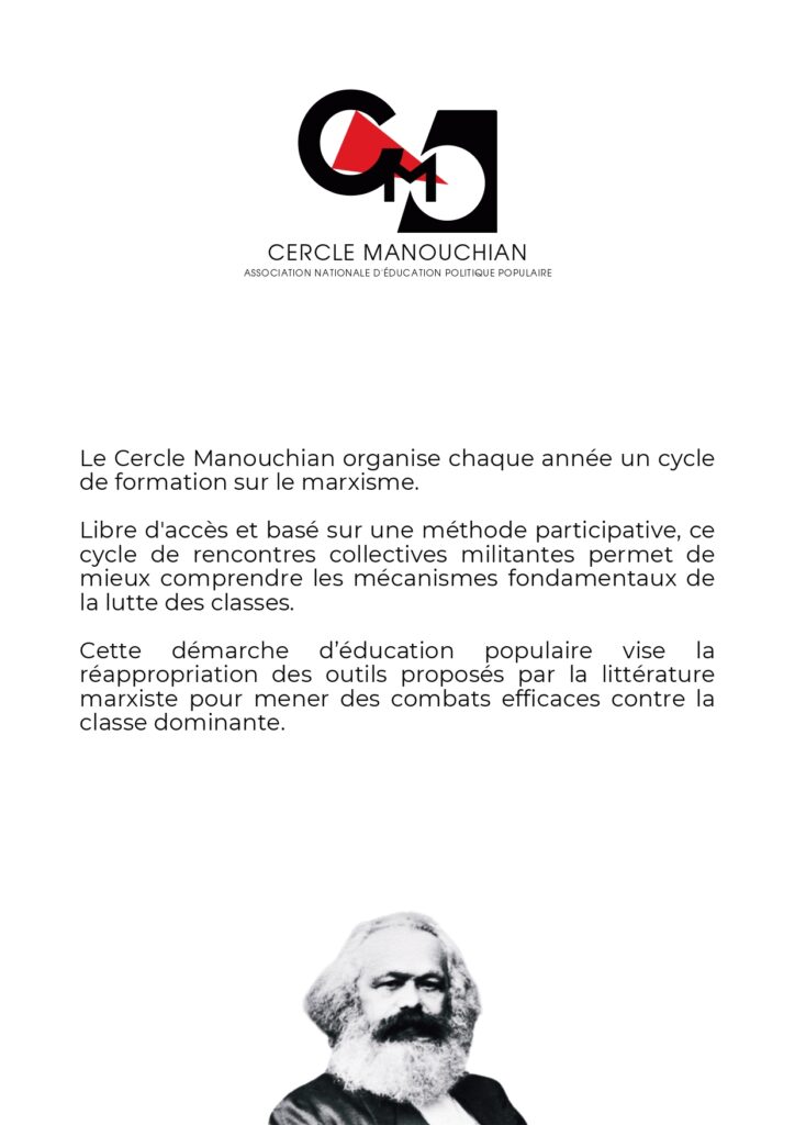 C’est pour cette raison que le Cercle Manouchian et le cercle Henri Barbusse se sont associés pour mettre en place une formation au marxisme. Elle s’adresse à tous ceux qui veulent comprendre le capitalisme pour le détruire et le remplacer par une autre société, sans exploitation : le socialisme.