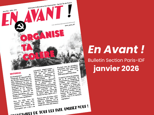 Publications Publications localesURC Paris-IDF Budget 2026 : Seul le Communisme assurera au Peuple la réponse à l’ensemble des besoins 21 février 2026 Communiqués Soutien aux militants internationalistes arrêtés en Turquie ! 20 février 2026 Communiqués Affaire de Lyon : quand l’État capitaliste tue 20 février 2026 Le ManifesteCampagne pour la paix Le syndicalisme, outil indispensable du combat pour la paix 14 février 2026 Notre journal "Le Manifeste" Le Manifeste n°33 janvier-février 2026 14 février 2026 Publications localesURC Paris-IDF Bulletin URC Paris-IDF · janvier/février 2026 12 février 2026 Campagne pour la paixURC Nord L’argent pour les salaires, pas pour la guerre : ensemble et unis, stoppons la marche à la guerre mondiale impérialiste 10 février 2026 Agenda 12/02 Ivry-sur-Seine. Meeting : Guerre coloniale et impérialiste là-bas, guerre sociale et raciale ici, un seul combat 9 février 2026 Publications localesURC Paris-IDF Contre la privatisation de la RATP ; agents-usagers : même combat ! Pour un monopole public des transports parisiens ! 9 février 2026 Communiqués Jolani, bas les pattes devant le Rojava ! 2 février 2026 Contributions Face à l’Empire, la présidente Delcy Rodriguez coude à coude avec les travailleurs du Venezuela 1 février 2026 Communiqués Yankee, bas les pattes de Cuba ! 1 février 2026 Précédent 1 2 3 4 5 6 7 8 9 10 Suivant